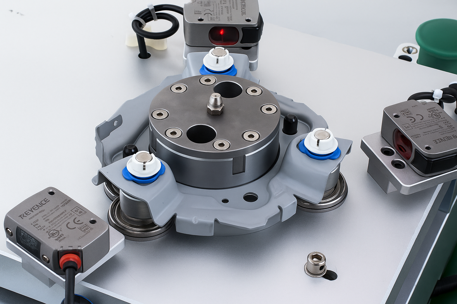Insertion machine for rubber or plastic bushing and/or collar with built in poka yoke system.