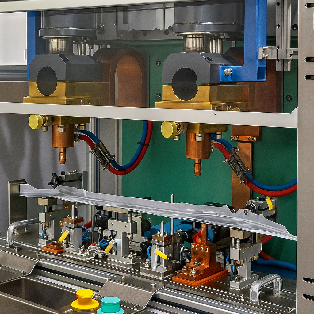 Customized resistance welders, with program controlled moveable weld guns, working with mounted fixtures or fixtures tendered by robotic arms, with optional nut feeder and vision system.